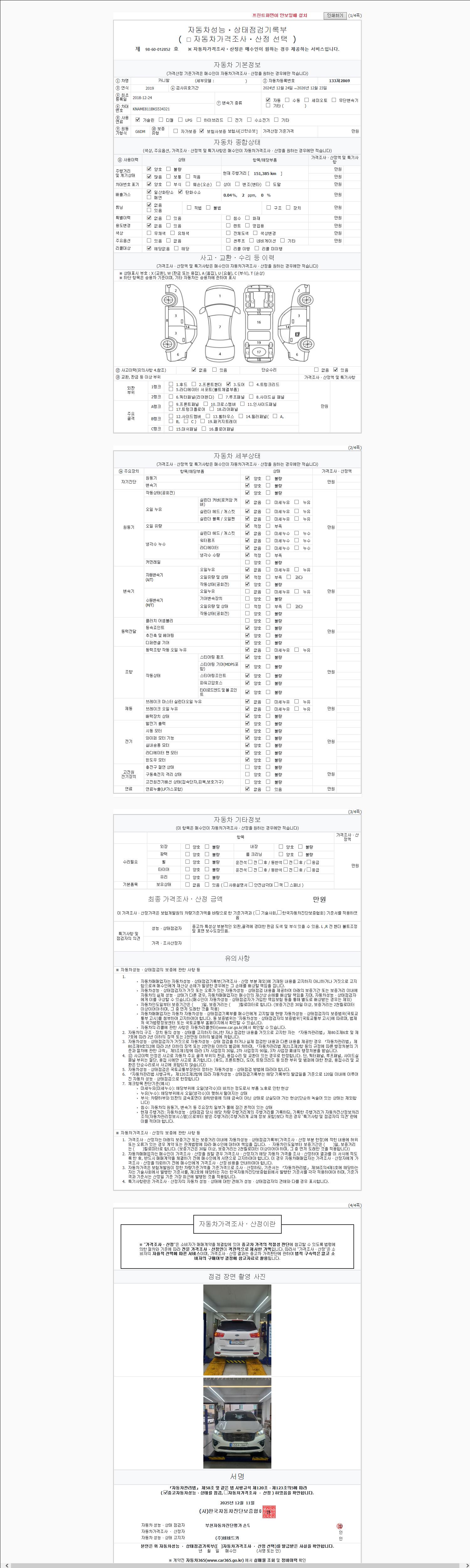 | 주행거리 | 151,384 km | 차량번호 | 133저2869 | 사고유무 | 성능기록부 참조 | 제시번호 | 제 2025228451 호 |