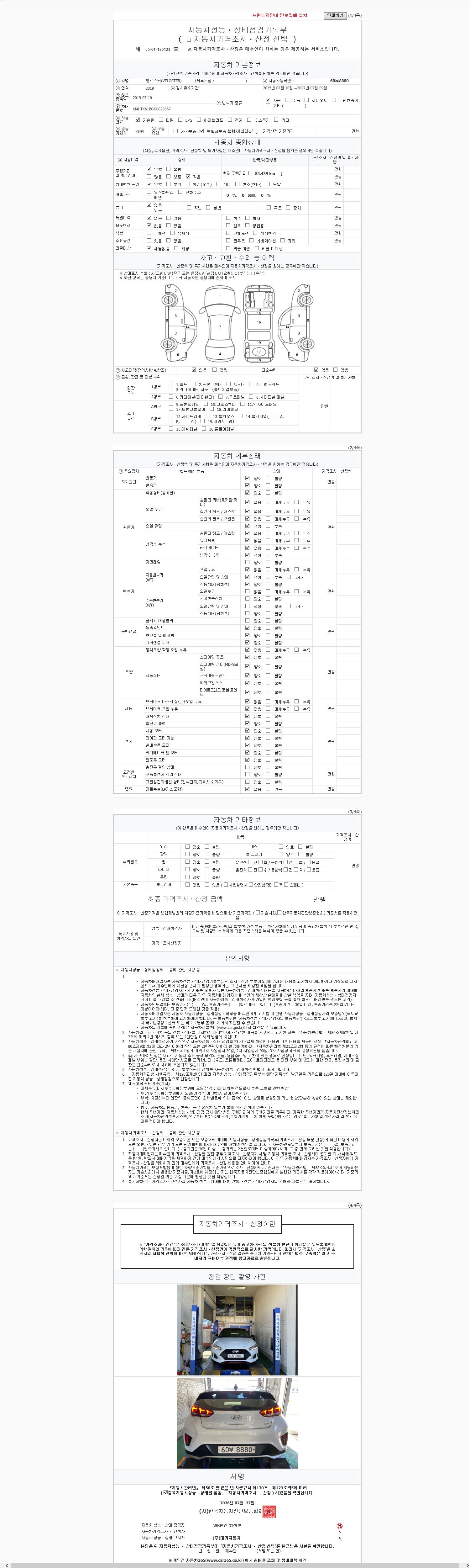-중고자동차 매매업자를 통해 차량을 구입하실 경우 반드시 "중고자동차 성능, 상태점검 기록부"를 교뷰 받으셔야 하며, 매매업자는 반드시 의무 교부 하여야 압니다.